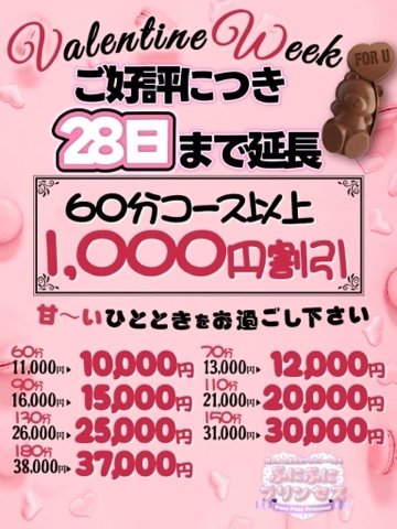 お得なイベント延長です! 2026/02/24 18:44:12 皆さんこんちにわ あんずです 今バレンタインイベントが好評のため28日まで延長しております!! めちゃお得! 本日18時から24時までの出勤です! 今週の出勤はこんな感じ 2/24(火)18:00~0:002/25(水)11:00~0:002/26(木)11:00~0:002/27(金)11:00~14:00 お時間合う方お待ちしてます! ✼••┈┈••✼••┈┈••✼••┈┈••✼••┈┈••✼ X旧Twitterも随時更新中です! 是非見てね🙂 @anzuanzu104